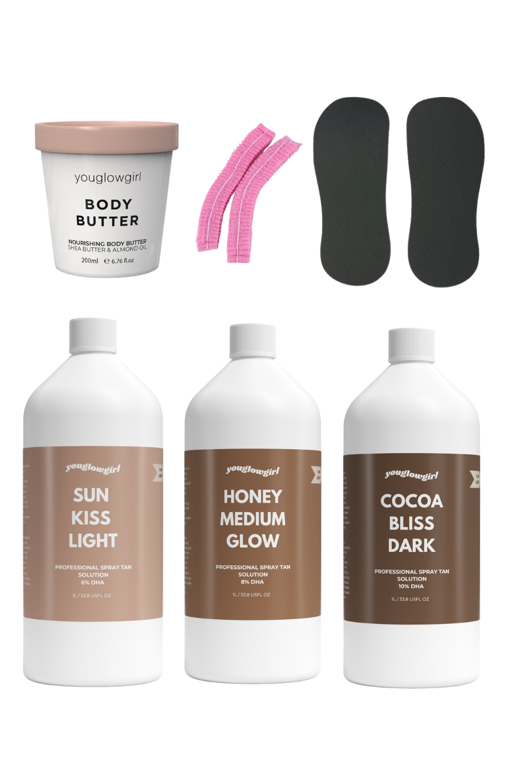- 3x YouGlowGirl Tanning Flüssigkeit (je 1 L – Light, Medium, Dark)