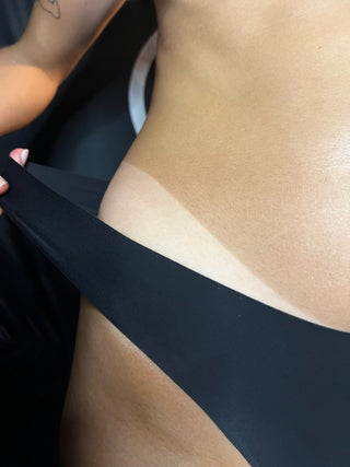 This is because the buttock crease is skin-on-skin (just like the area under the breast). Even if we blend the area cleanly during the spray tan, the color often "wears off" again during the development time due to constant skin contact.